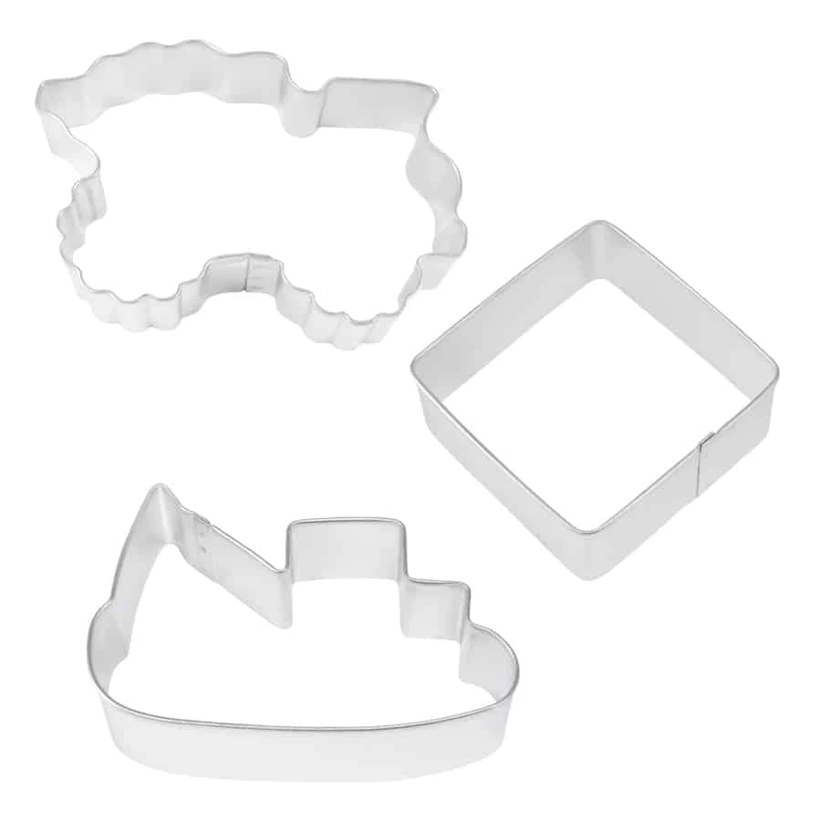 Party zone ahead! Plan the perfect construction themed birthday or event with these high quality tinplated steel cutters with 1” deep steel sides. Set includes Dump Truck 4″, Square 2.5″ and a Excavator 4″. Hand wash and dry thoroughly before storing.