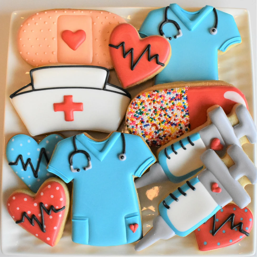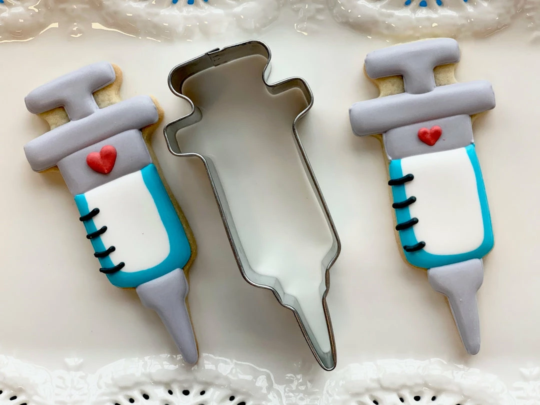 This Nurse Cookie Cutter Bundle was created for an online class hosted The Flour Box! Purchase the recording of the class. CLICK HERE TO PURCHASE THE CLASS RECORDING. The cost for the class recording is $20. Get ready for the class with this cutter bundle! Tinplated steel Nurse cookie cutter set. Includes: Pill 3.75″, Syringe 4 3/8″, Nurse Hat 3 7/8″, Tee Shirt 3.5″ and Heart 2″. Hand wash and dry thoroughly before storing.