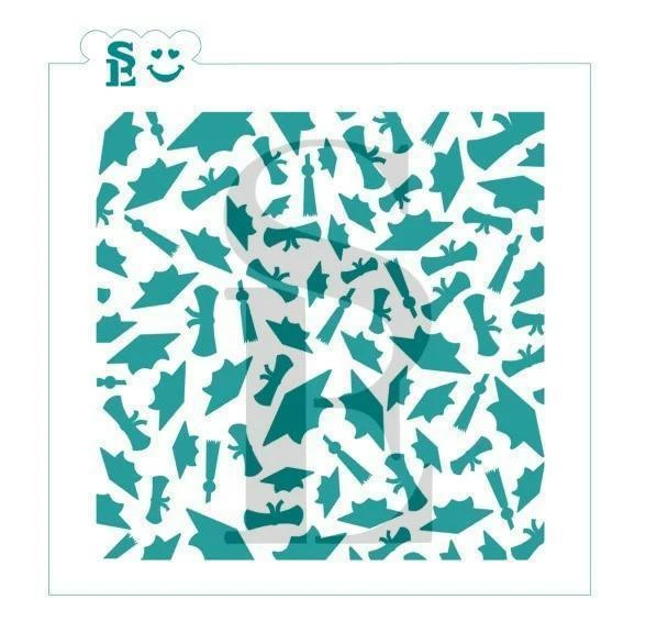 Graduation Background SE stencil. Design sizes are approximately 4.75″ and 4.75″. Overall size is 5.75″ x 5.75″. Stencils are Food Grade plastic, washable and reusable. Handmade by Stencil Expressions in the USA. Stencils for cookies, cakes, culinary & more.