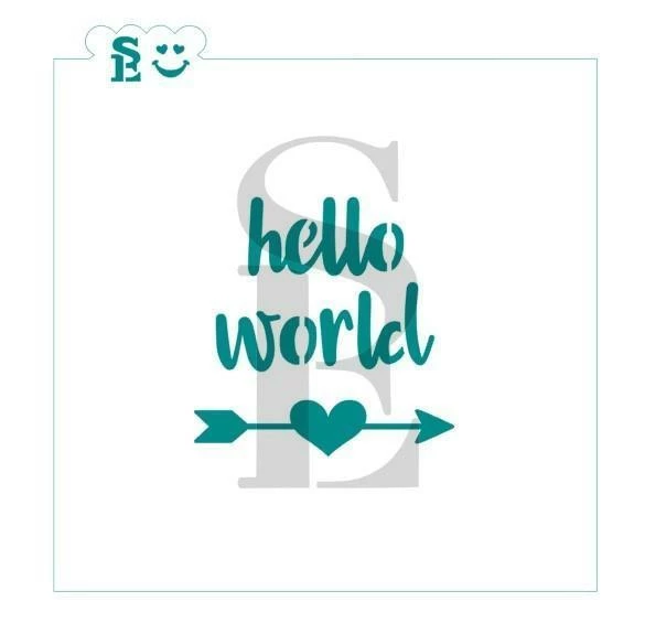 Hello World SE stencil. Design sizes are approximately 2.75″ and 2.75″. Overall size is 5.75″ x 5.75″. Stencils are Food Grade plastic, washable and reusable. Handmade by Stencil Expressions in the USA. Stencils for cookies, cakes, culinary & more.