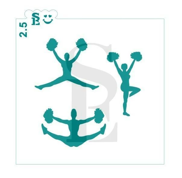 Cheerleader Silhouttes SE stencil. 3 Design sizes are approximately 2.0″ x 2.5″, 1.375″ x 2.5″, 1.5″ x 2.5″. Overall size is 5.75″ x 5.75″. Stencils are Food Grade plastic, washable and reusable. Handmade by Stencil Expressions in the USA. Stencils for cookies, cakes, culinary & more.