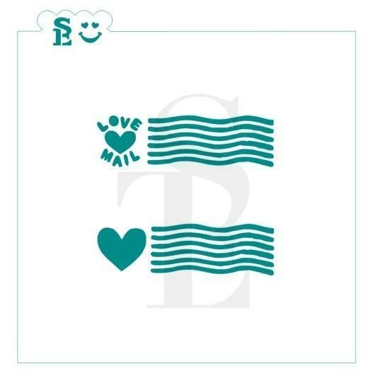 Love Mail Postage Stamp SE stencil. Design sizes are approximately  0.875″ x 3.0″. Overall size is 5.75″ x 5.75″. Stencils are Food Grade plastic, washable and reusable. Handmade by Stencil Expressions in the USA. Stencils for cookies, cakes, culinary & more.