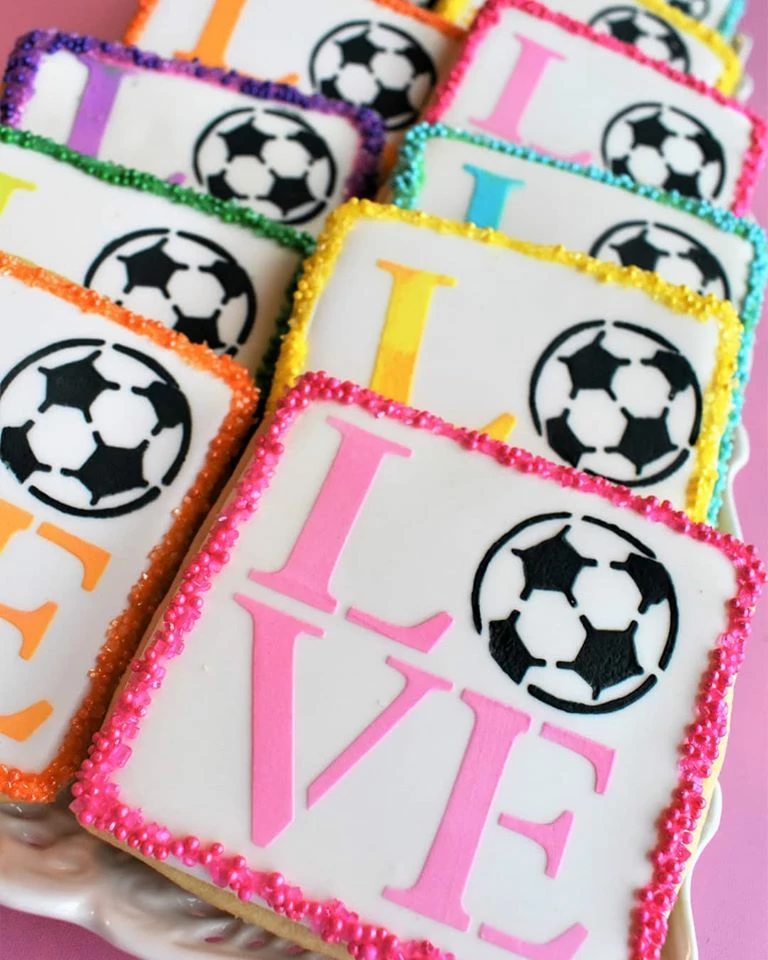 LOVE Soccer SE stencil. Design sizes are approximately 2.50″ and 2.50″. Overall size is 5.75″ x 5.75″. Stencils are Food Grade plastic, washable and reusable. Handmade by Stencil Expressions in the USA. Stencils for cookies, cakes, culinary & more.