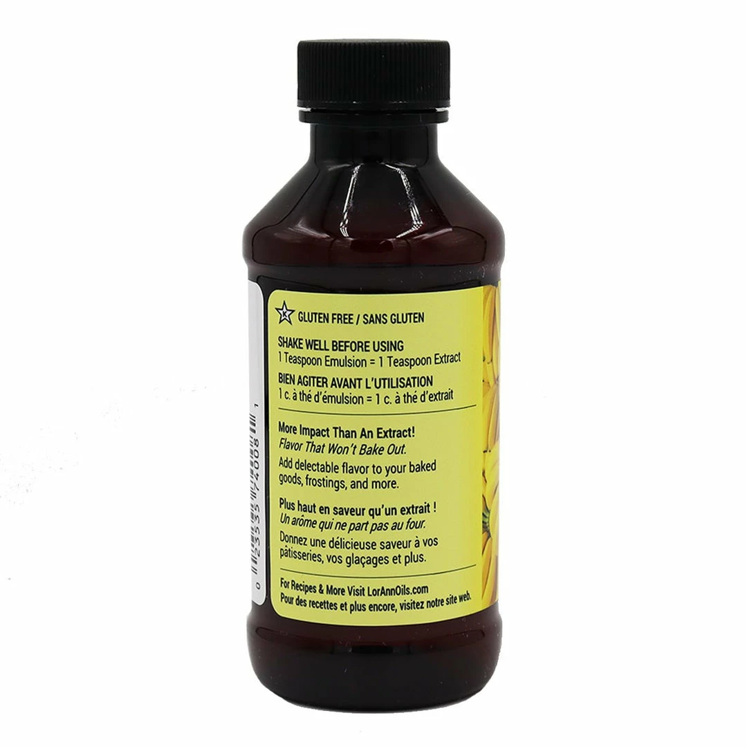 Banana baking & flavoring emulsion use banana emulsion will impart the luscious flavor of perfectly ripened bananas. This professional emulsion will not ‘bake-out’. Use 1 tsp of emulsion for 1 tsp of extract. This bottle is 4 oz.