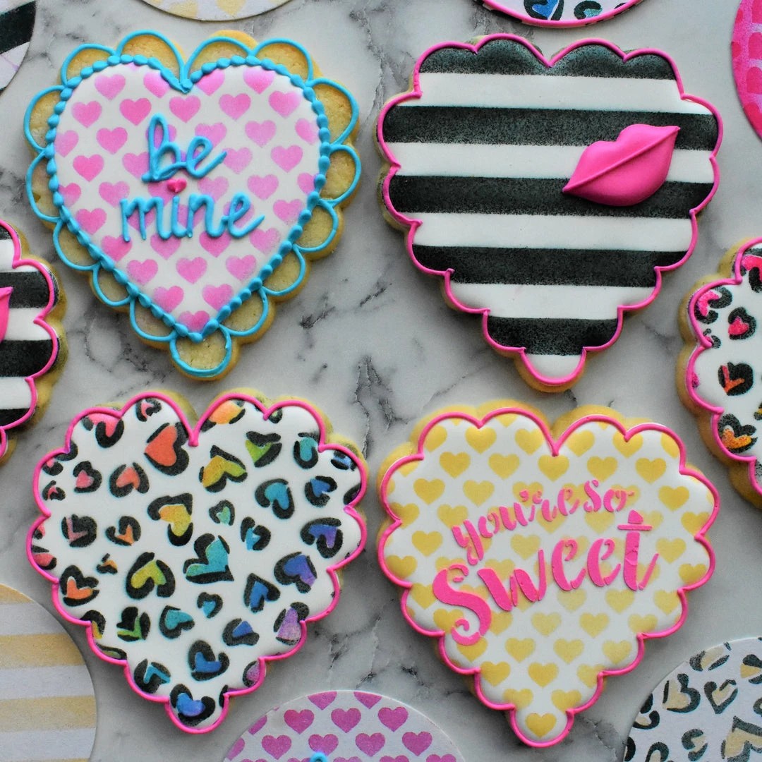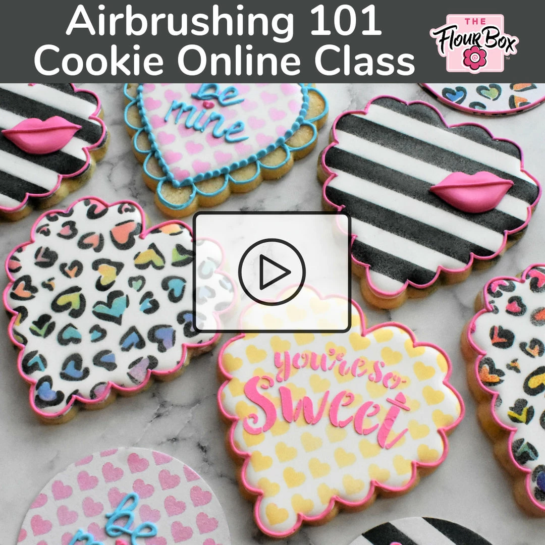 Join Anne Yorks of The Flour Box for an online class and decorate 4 Airbrush Valentine designs with royal icing and airbrushing:  Scallop Heart Cookie Cutter, and these stencils: Small Heart, You’re So Sweet, Wide Stripe, and Leopard Heart 2pc Set. In this class, we are going to review the basics: understanding the care of the gun, talk about metallics, review tips for airbrushing with dark colors, creating rainbow, using layered stencil sets, and more! Class includes a detailed prep guide, recording of class, and cookie and icing recipes. *Prep guide will be emailed to you after you register for the class.Â
