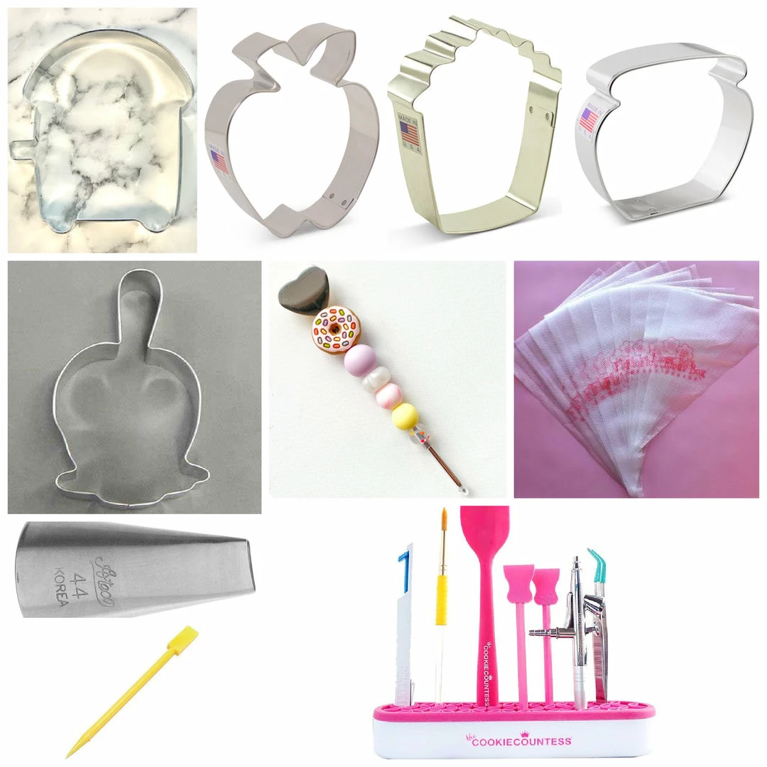 Apple Harvest Cookie Decorating Kit. Recreate the Apple Harvest Cookie Set. There are so many FUN goodies in this box! This kit includes: FIVE cutters (Cart, Cute Apple, Caramel/Candy Apple, Popcorn, and Honey Pot), Donut Worry Be Happy Scribe, Brush and Tool Holder, Wilton Tip #44, Boo Boo Stick, 10 Tipless Bags (5 10″ and 5 13″)! **kit does not include standard decorating supplies like ingredients, standard tips like #1 or #2, or food gels. These need to be purchased separately