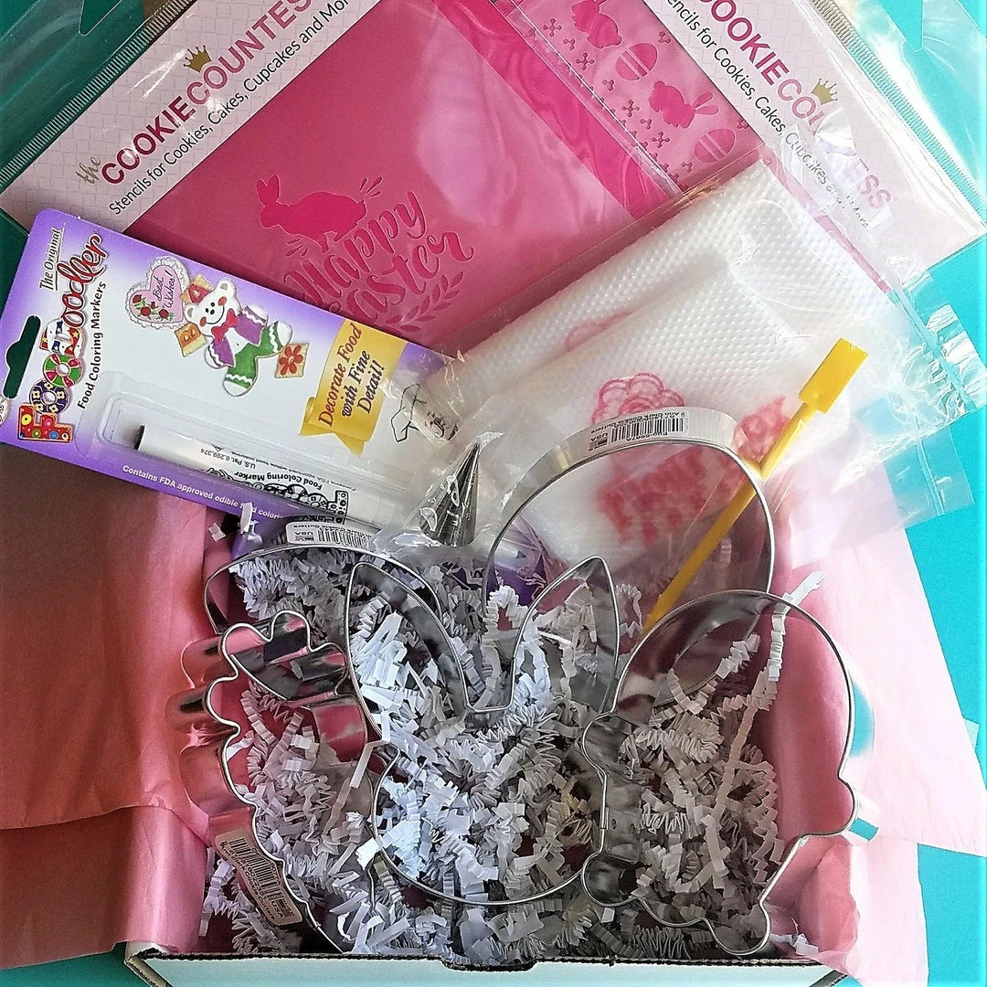 Happy Easter Decorating Kit. Recreate the Happy Easter Cookie Set. There are so many FUN goodies in this box! This kit includes: FIVE cutters (bunny face, carrot, basket, 4″ Egg, and 2.5″ Egg), TWO stencils (Fair Isle Easter and Happy Easter with Bunny), Boo Boo Stick, Tip #263, Ultra Fine Black Foodoodler, 10 Tipless Bags (5 10″ and 5 13″)! **kit does not include standard decorating supplies like ingredients, standard tips like #1 or #2, or food gels. These need to be purchased separately
