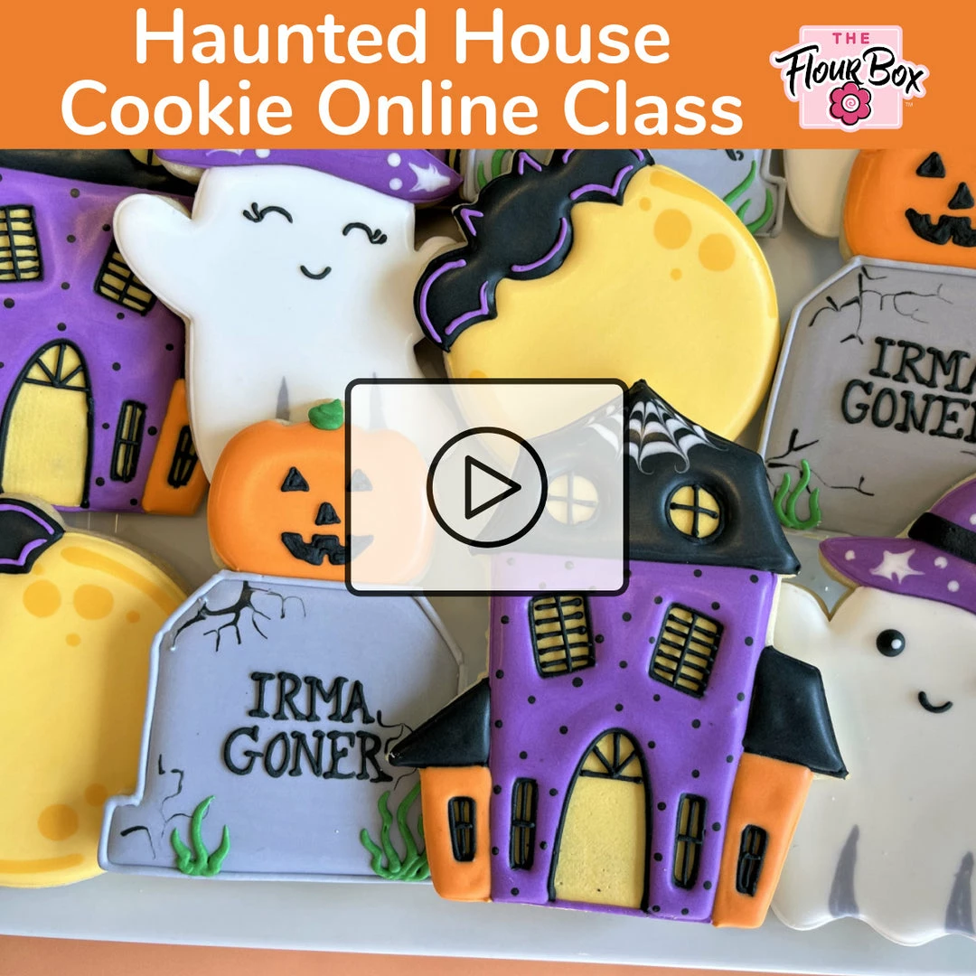 Join Anne Yorks of The Flour Box for an online class and decorate 4 Haunted House designs with royal icing: Haunted House, Moon and Bat, Tombstone with Pumpkin, and Ghost in Hat. In this class you will learn how to stencil with royal icing, use a cookie template, use tip #44, and how to incorporate wet-on-wet techniques to make your cookies interesting. Class includes a detailed, full-color prep guide with step-by-step photos and instructions for each project, recording of class, and cookie and icing recipes. Prep guide will be emailed to you after you register for the class.