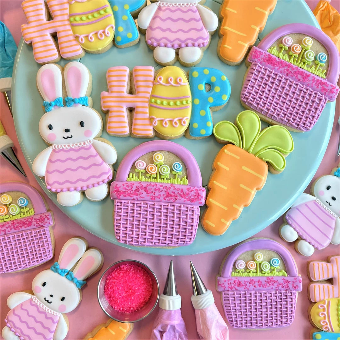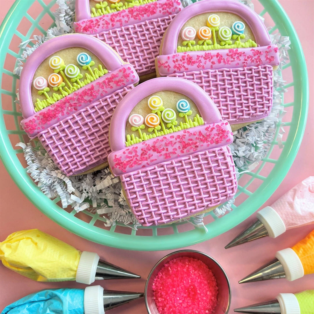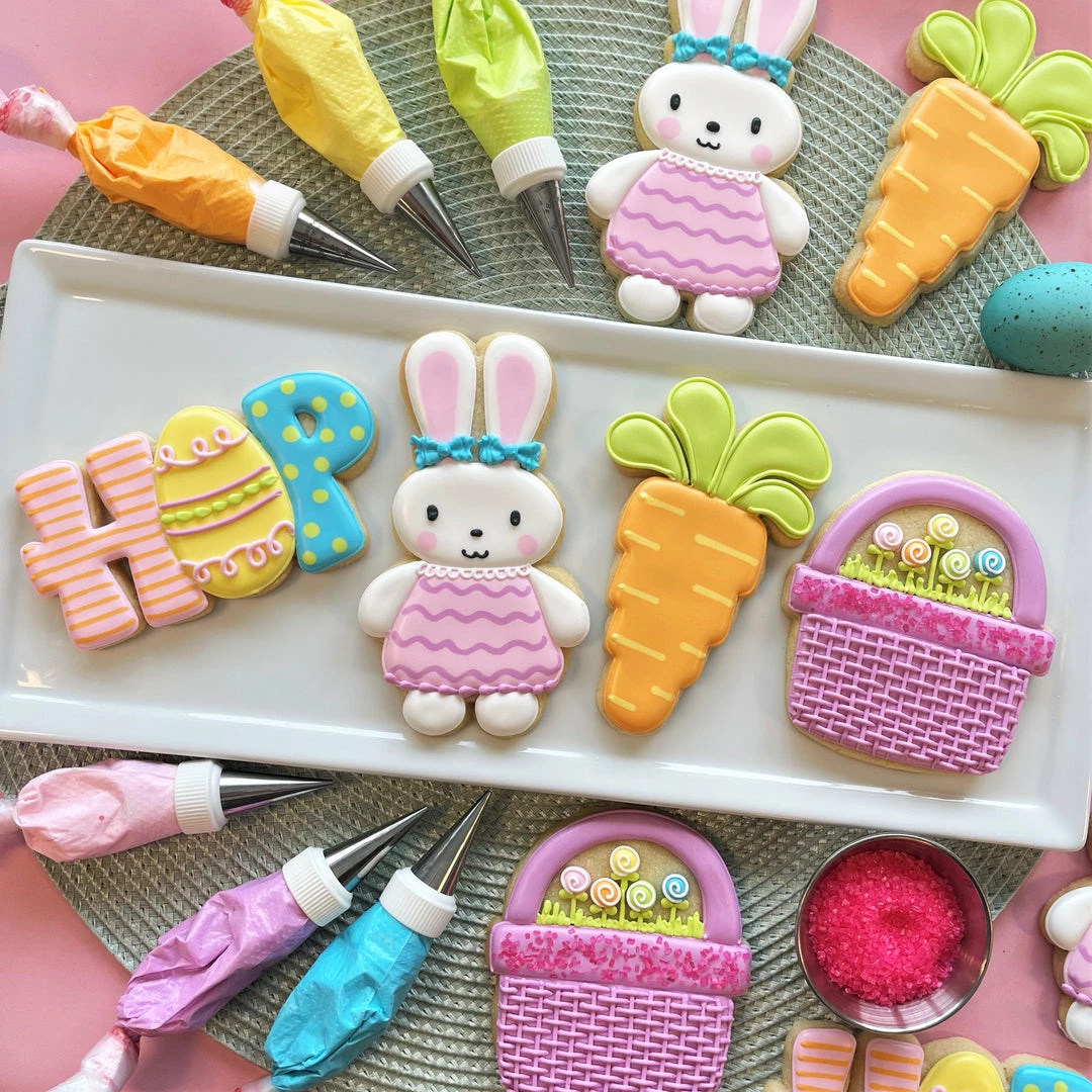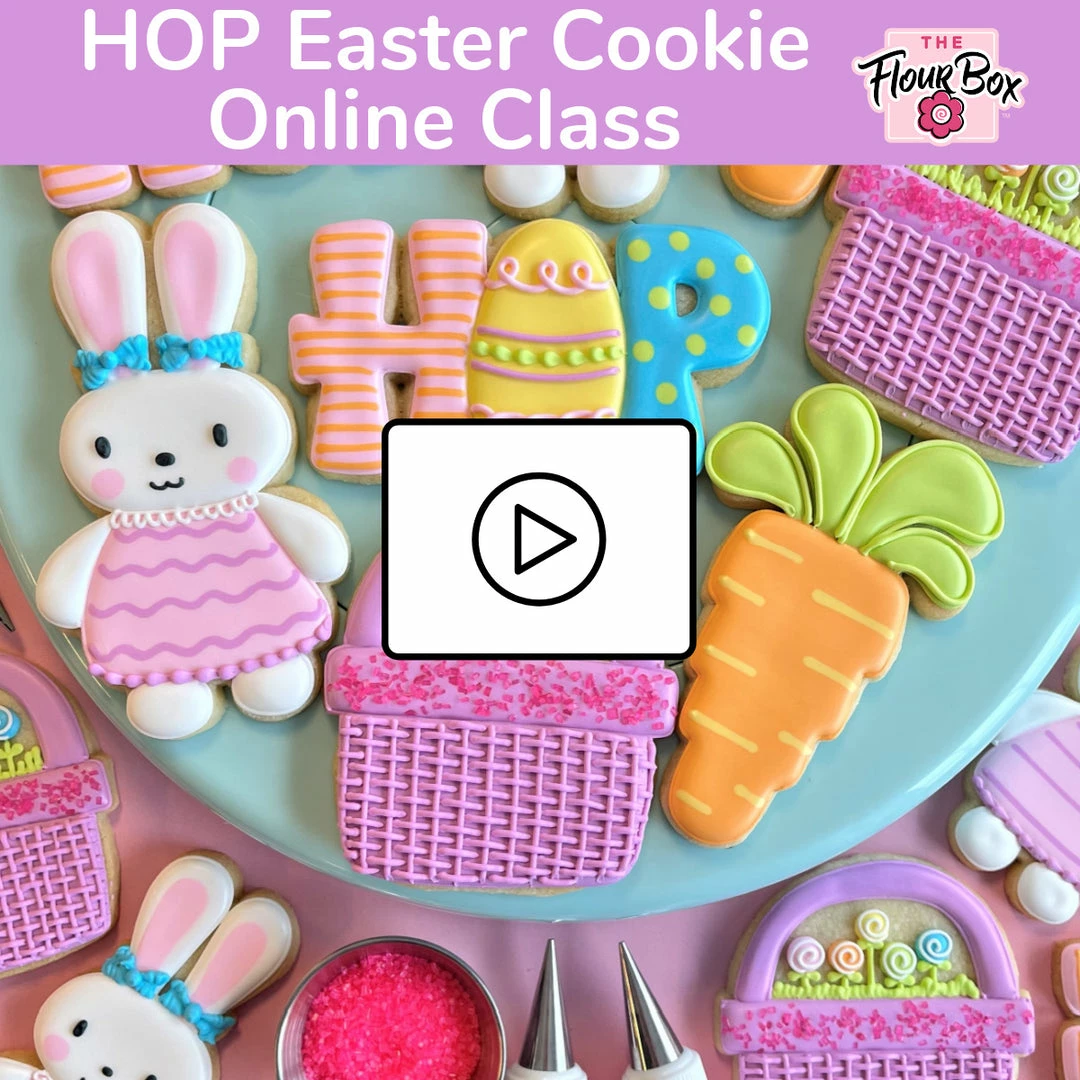 Hippity Hoppity Easter is on the way! Join Anne Yorks of The Flour Box for an online class and decorate 4 Easter HOP designs with royal icing: the Darling Bunny, the Wide Basket, the Floppy Carrot, and the HOP cookie. Purchase the recording of the class. CLICK HERE TO PURCHASE THE CLASS RECORDING. The cost for the class recording is $20. Get ready for the class with this kit! In this class you will learn how to create each design step-by-step using a piping and flooding decorating method. You’ll learn how to create a basket weave texture in icing, wet-on-wet techniques, and simple flowers. This class is great practice for piping lines, loops, and bead borders! Class includes a detailed, full-color prep guide with step-by-step photos and instructions for each project, recording of class, and cookie and icing recipes. *Prep guide will be emailed to you after you register for the class.Â