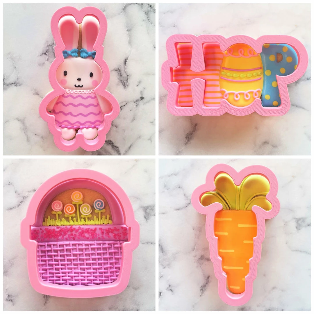 The cutter bundle includes the 4 cutters:  Darling Bunny measures 5″ tall x 2.75″ wide, Floppy Carrot  measures 4.5″ tall x 2.5″ wide, HOP measures 2.25″ tall x 4″ wide, and Wide Basket measures 3.5″ tall x 3.25″ wide.
