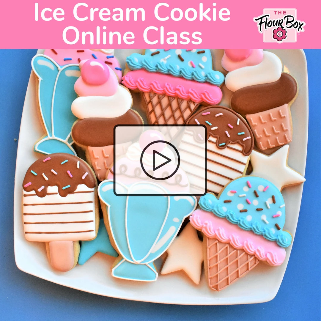 I scream you scream, we all scream for ice cream….COOKIES! Join Anne Yorks of The Flour Box for an online class and decorate 4 Ice Cream designs with royal icing: Ice Cream Cone, Popsicle, Soft Serve, and Sundae. In this class you will learn how to create each design step-by-step using a piping and flooding decorating method. Class includes a detailed prep guide, recording of class, and cookie and icing recipes. *Prep guide will be emailed to you after you register for the class.Â