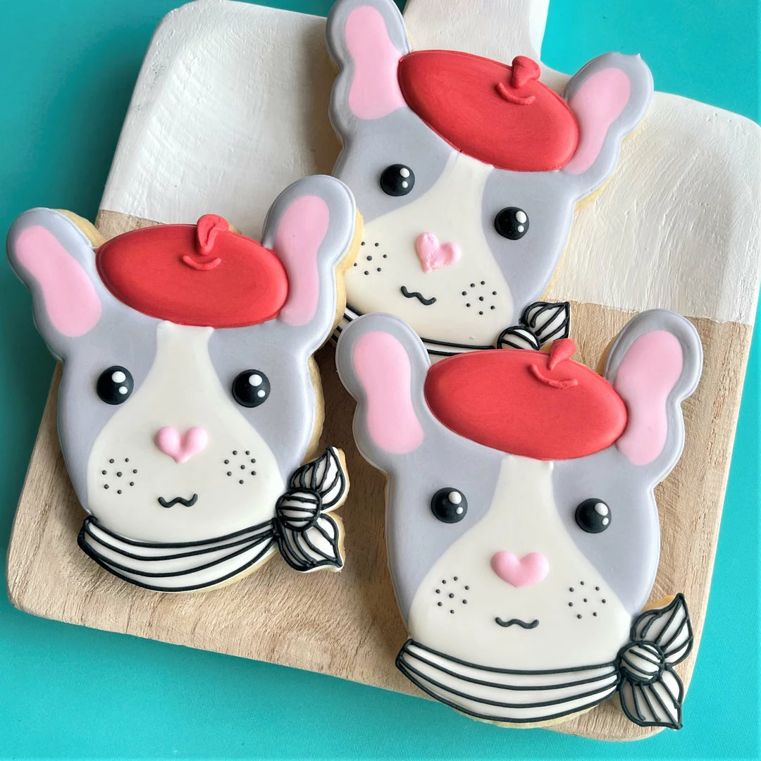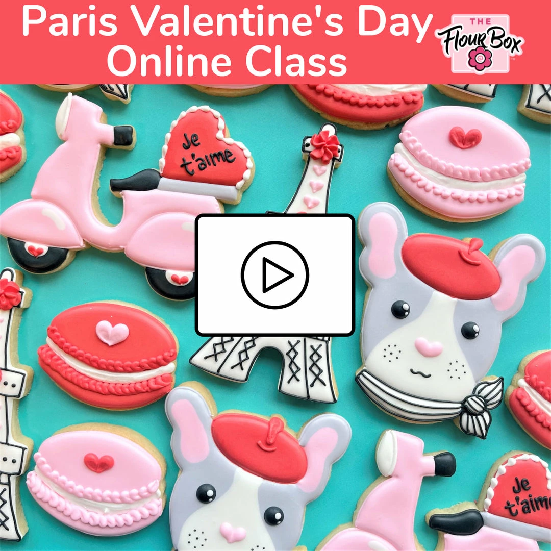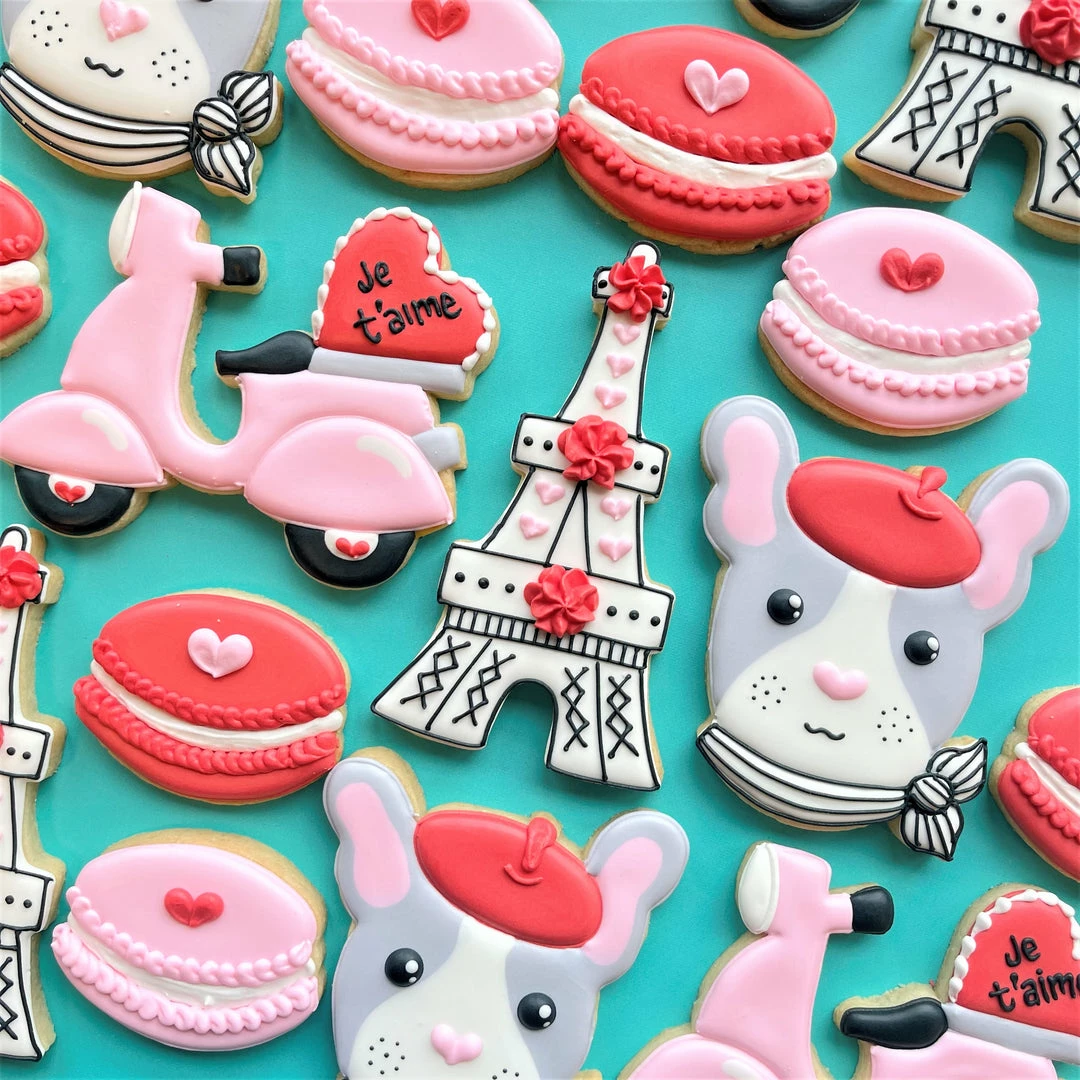 Ooh la la! Join Anne Yorks of The Flour Box for an online class and decorate 4 Paris designs with royal icing: the Eiffel Tower, the French Bulldog, the Macaron, and the Scooter. In this class you will how to create each design step-by-step using a piping and flooding decorating method. You’ll learn some foundational icing accents like hearts, tight loops, fine piped lines (using a tip #1), and easy ruffle flowers (with tip #129). Templates for the Scooter and the French Bulldog are provided as well as a piping practice sheet. Class includes a detailed, full-color prep guide with step-by-step photos and instructions for each project, recording of class, and cookie and icing recipes. *Prep guide will be emailed to you after you register for the class.Â