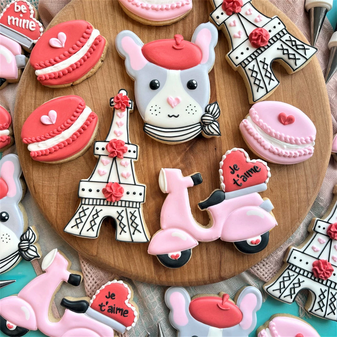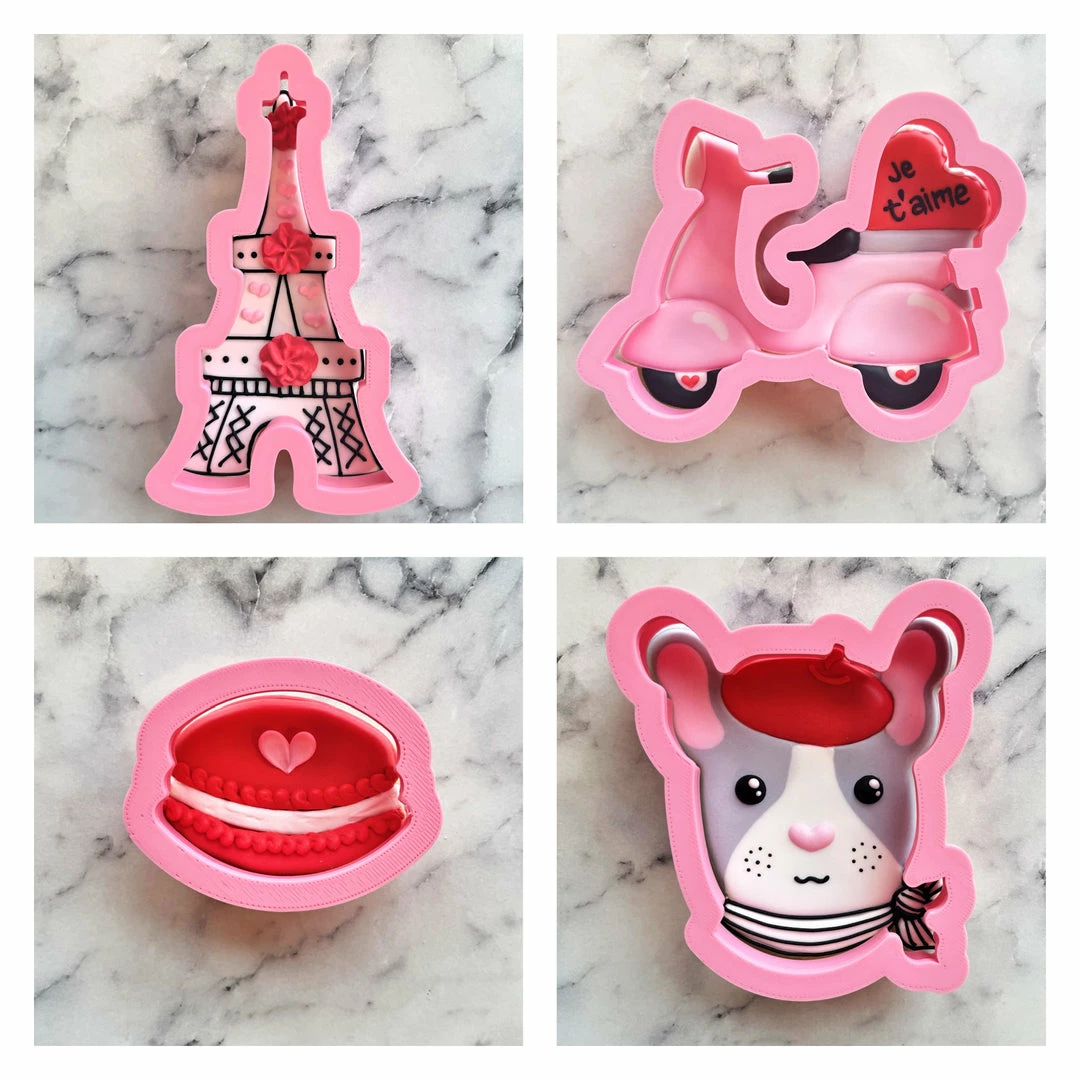 The cutter bundle includes the 4 cutters: Eiffel Tower measures 4.25″ tall x 2.75″ wide, French Bulldog Face measures 3.25″ tall x 3″ wide, Macaron Mini measures 1.75″ tall x 2.25″ wide, and Scooter measures 3.25″ tall x 4″ wide.