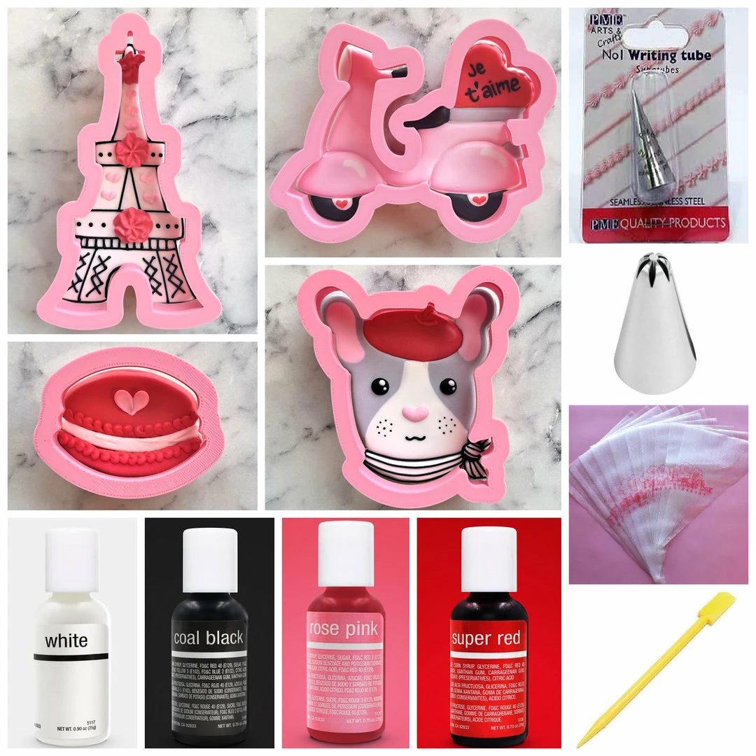 The kit includes four cutters: French Bulldog Face, Eiffel Tower, Scooter, and Macaron, Boo Boo Stick, 10 Icing Bags, PME tip #1, 1 Tip #129, and 4 gel colors: white, coal black, rose pink, super red. (kit does not include the couplers, tips #2, or yellow marker.)