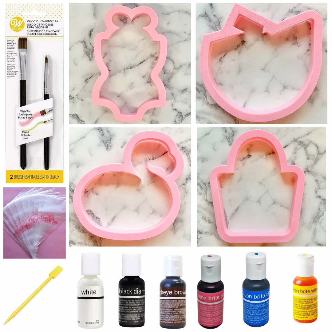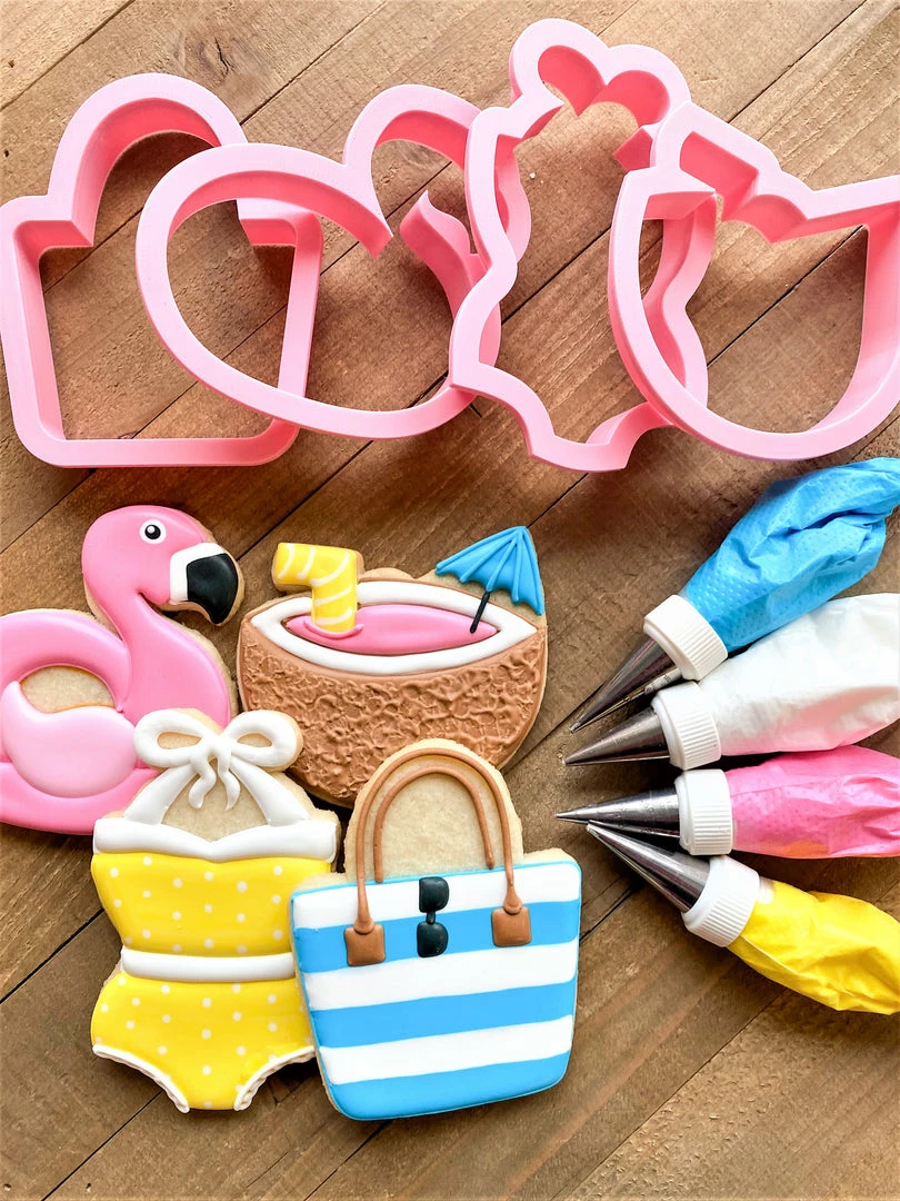 The kit includes four cutters: Swimsuit with Bow, Coconut Drink, Flamingo Float, and Beach Bag.  Also included is a Wilton 2 pc brush set, 12 tipless bags, 2-1 tool, and 6 Chefmaster Food Gels: Neon Pink, Neon Blue, Neon Yellow, Buckeye Brown, Black Diamond, and Bright White.Â