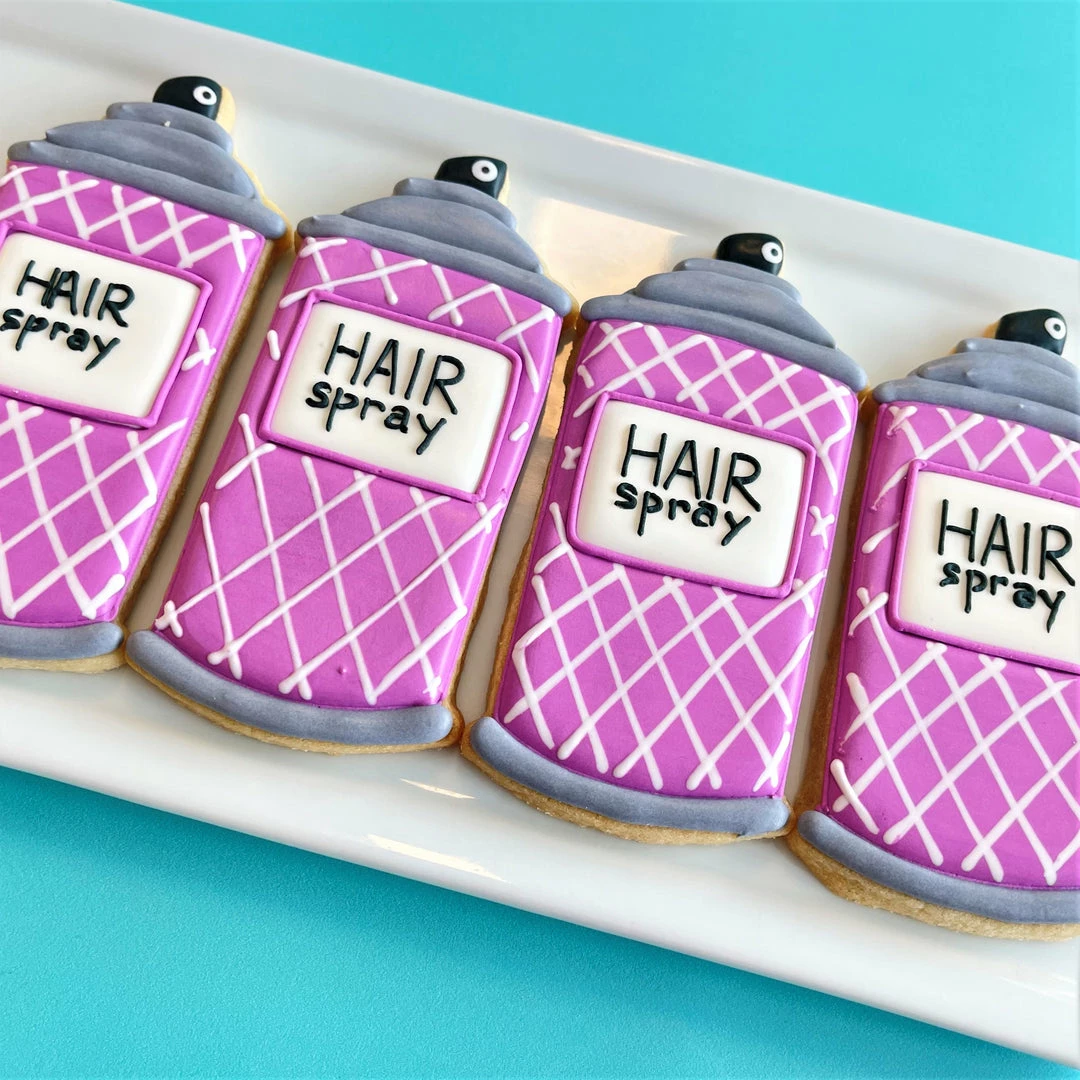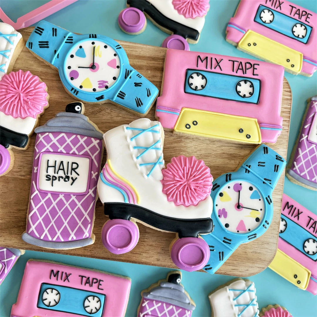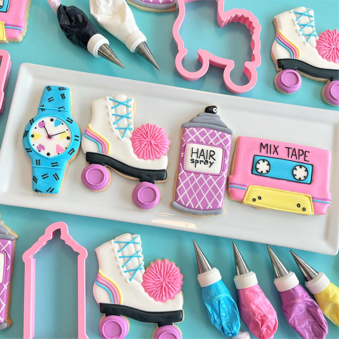 This class is going to be RAD! Join Anne Yorks of The Flour Box for an online class and decorate 4 Totally 80s designs with royal icing: Mix Tape, Roller Skate, Hair Spray, and Cool Watch.  Purchase the recording of the class. CLICK HERE TO PURCHASE THE CLASS RECORDING. The cost for the class recording is $20. Get ready for the class with this kit! In this class you will learn how to create each design step-by-step using a piping and flooding decorating method. We will explore how to use 20-sec icing. There are tons of wet-on-wet techniques also featured in this class. And you’ll get practice transferring a template to the cookie! Class includes a detailed, full-color prep guide with step-by-step photos and instructions for each project, recording of class, and cookie and icing recipes. *Prep guide will be emailed to you after you register for the class.Â