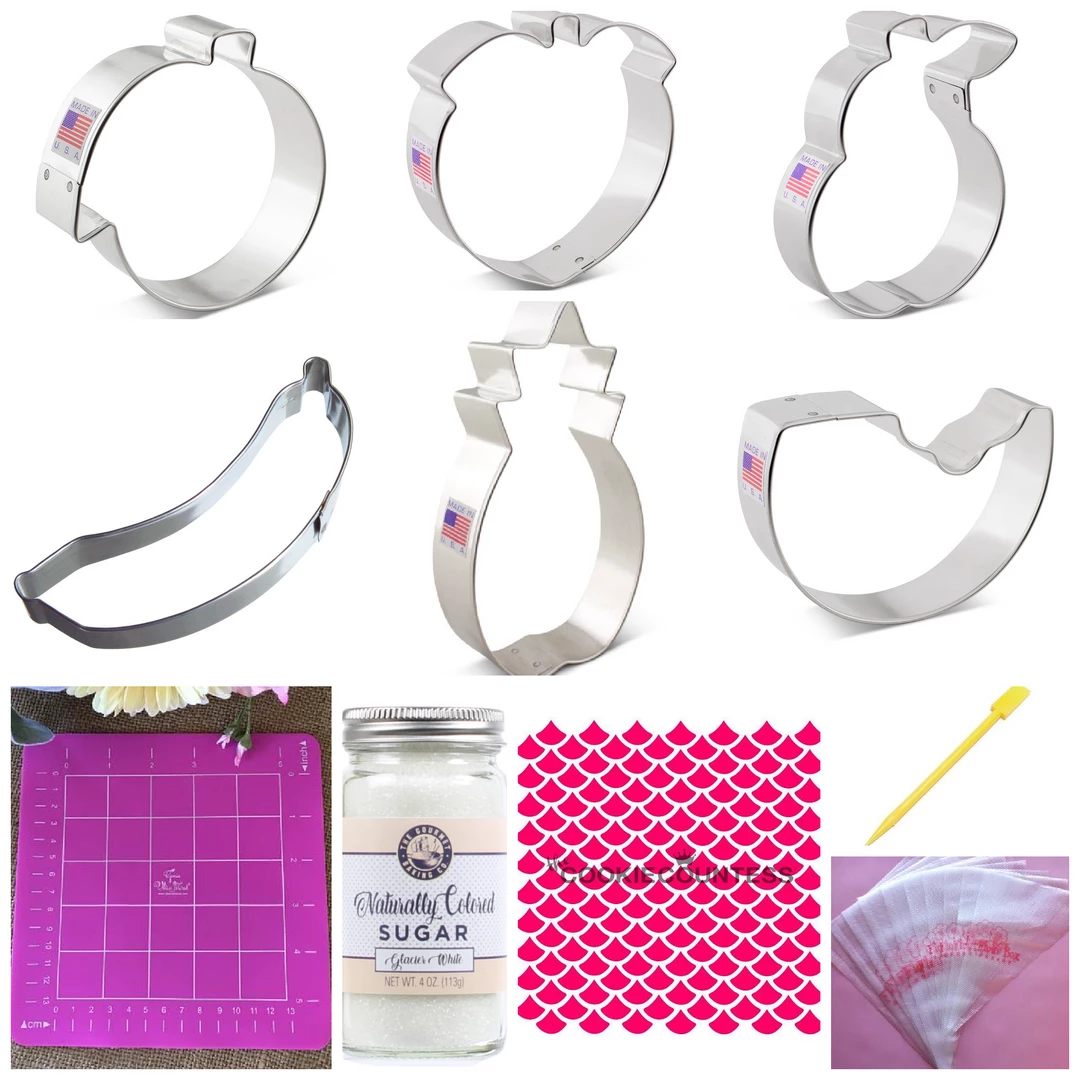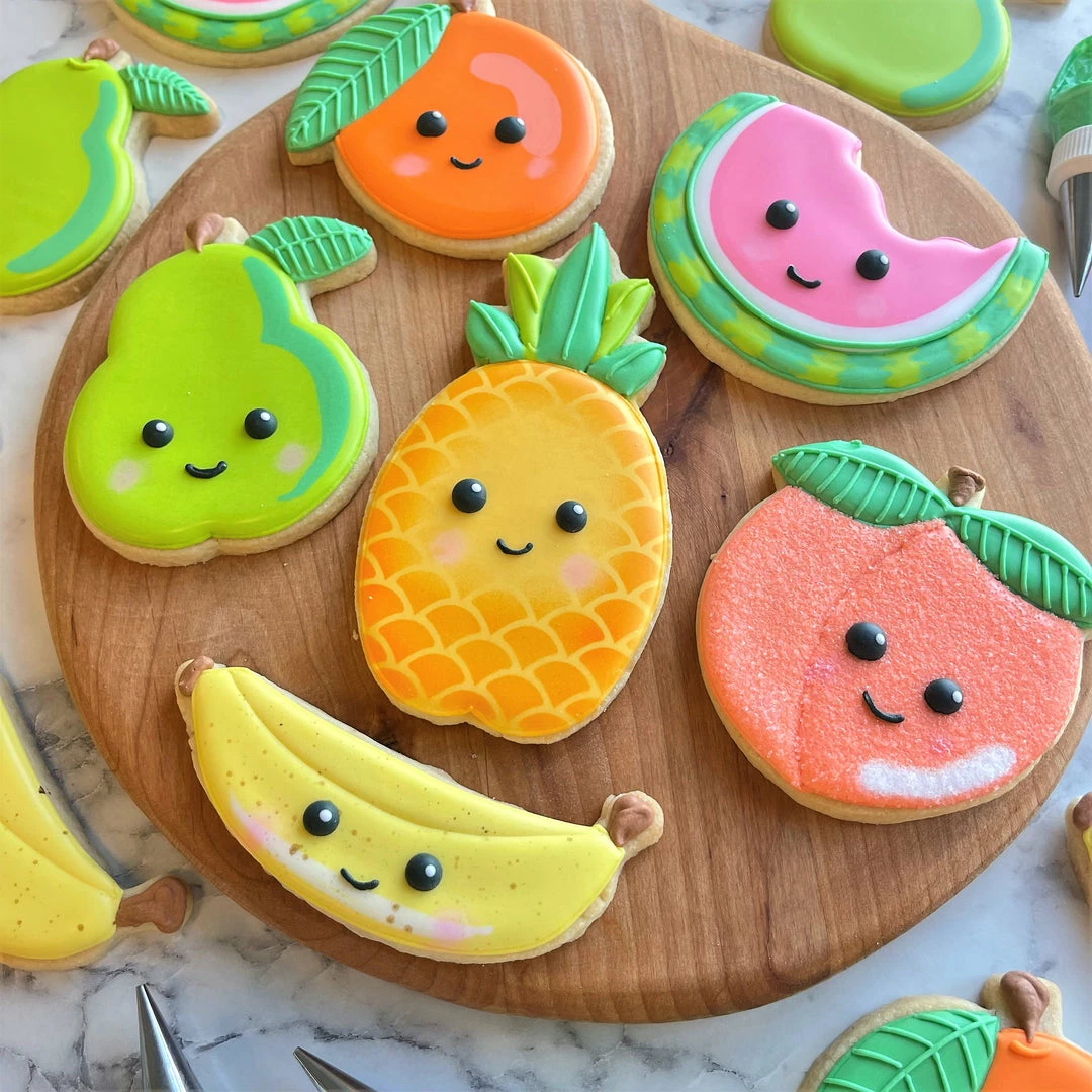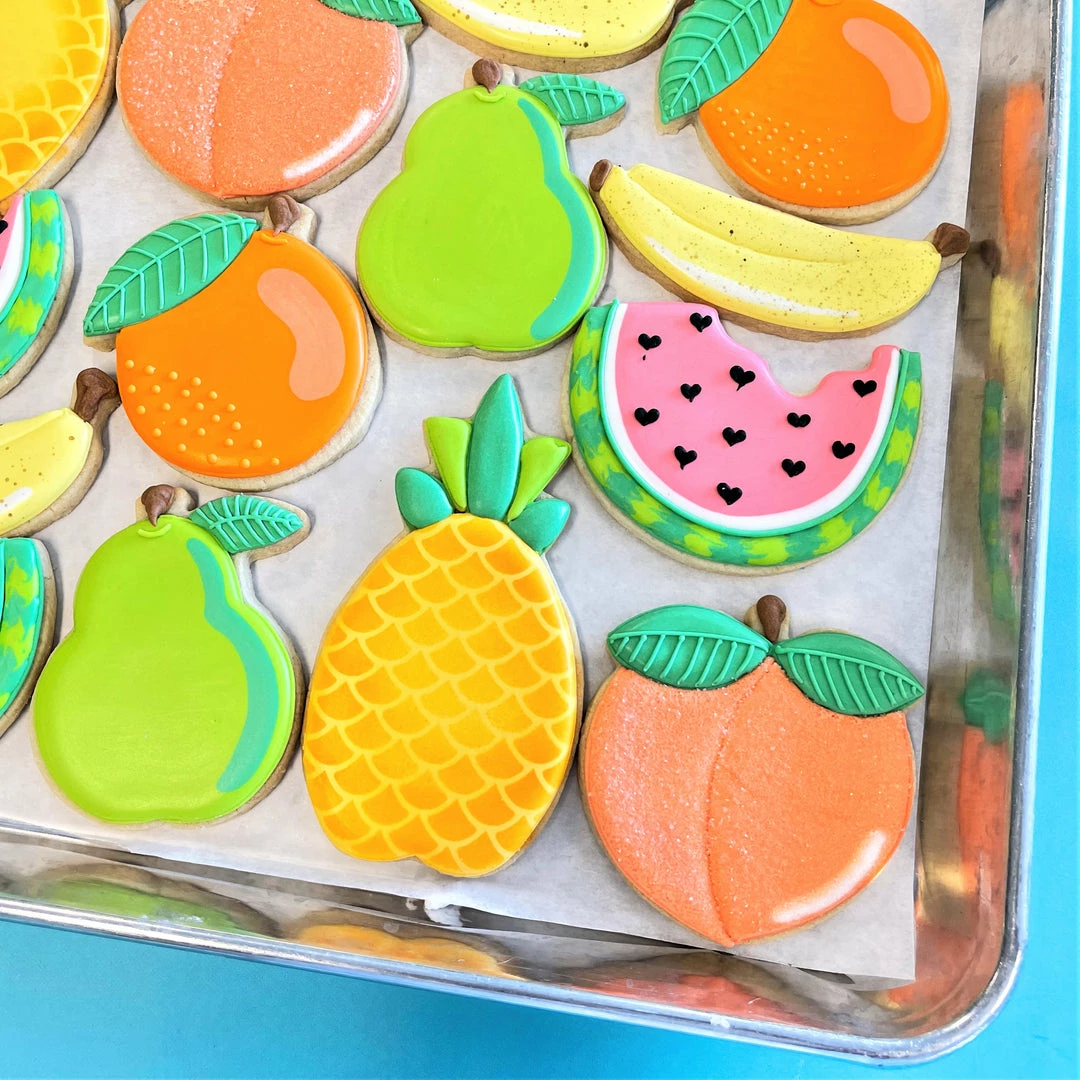 Tutti Frutti Cookie Decorating Kit. Recreate the Tutti Frutti Cookie Set. There are so many FUN goodies in this box! This kit includes: SIX cutters (Peach, Pear, Watermelon, Banana, Pineapple, Orange), Scales Stencil, White Sugar, Genie 7 x 7 Mini Mat, Boo Boo Stick, 10 Tipless Bags (5 10″ and 5 13″)! **kit does not include standard decorating supplies like ingredients, standard tips like #1 or #2, or food gels. These need to be purchased separately