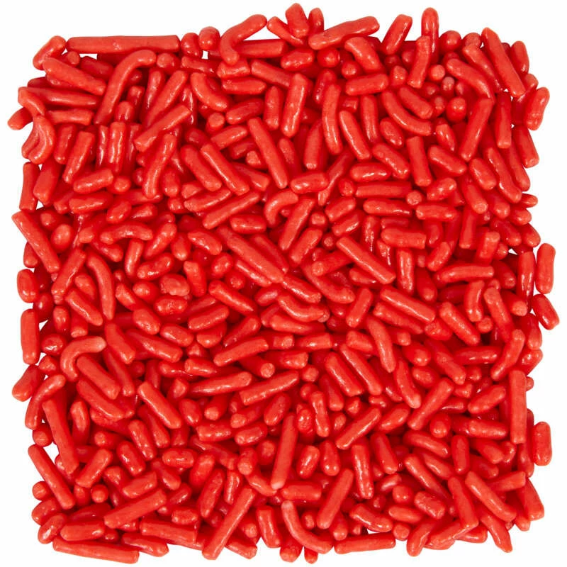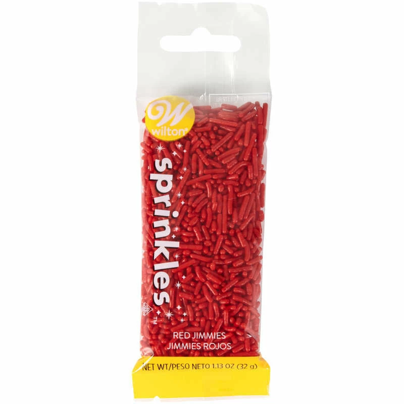 Any sweet treat is more fun with a dash of sprinkles. Red jimmies come in a convenient small pouch and can be used on cookies, cupcakes, candy and even ice cream. Certified kosher. Weight: 1.1oz (32 g).