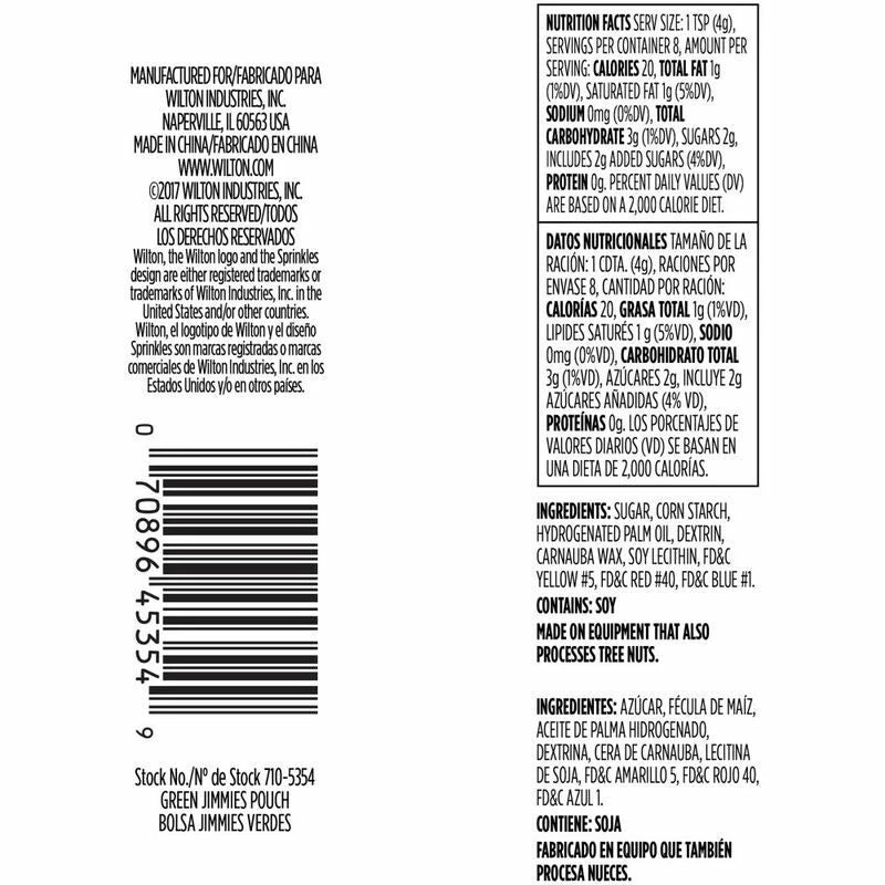 Any sweet treat is more fun with a dash of sprinkles. Green jimmies come in a convenient small pouch and can be used on cookies, cupcakes, candy and even ice cream. Certified kosher. Weight: 1.13oz (32 g).