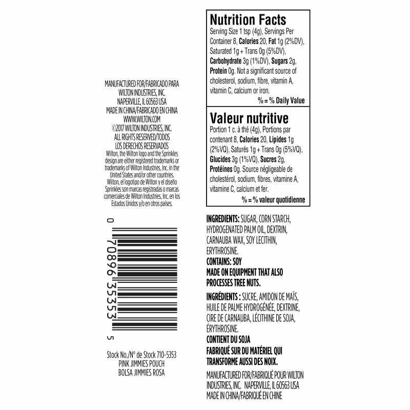 Any sweet treat is more fun with a dash of sprinkles. Pink jimmies come in a convenient small pouch and can be used on cookies, cupcakes, candy and even ice cream. Certified kosher. Weight: 1.13oz (32 g).